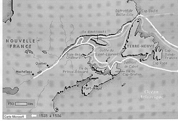 Je repars pour la deuxième fois sur l`ordre du roi François 1er en 1535.Je remonte le fleuve, auquel je donne à cette occasion le nom de Saint-Laurent, jusqu`au village indien de Stodaconé, où commencera sans doute un jour le Québec. Ensuite je continue en amont du fleuve jusqu`au village indien de Hochelaga et escalade la colline située derrière le village pour voir l` Ottawa et les rapides de Lachine. J`appelle la colline Mont Réal (Mont Royal), d`où dérive le nom de la ville de Montréal. Partant pour mon troisième voyage en 1541, je repars à nouveau vers le Saint-Laurent, remontant cette fois jusqu`au rapide de Lachine. Je retourne en France, je m`installe à Saint-Malo et rédige un compte rendu de mes expéditions que je publie en 1545. |